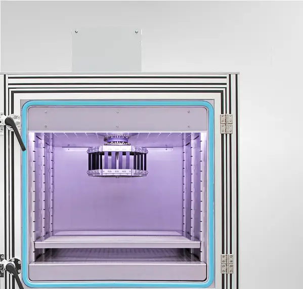 The Anseros Ozone Climate Simulator SIM7500-TH is equipped with a patented longitudinal airflow system. Two screens are located on top and at the bottom to distribute the ozone air longitudinally to the axle of the samples with high flow rates of 600 mm/s or with low flow rates down to 8 mm/s, in which case the ozone attack is 70% lower.