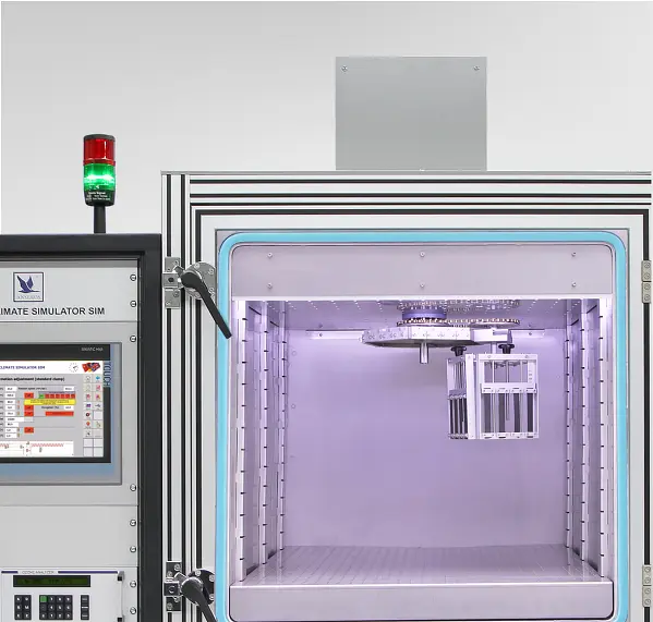 The carousel motion will be used in case of low air velocities (> 8 mm/s) to avoid the effect of a profile in ozone concentration, temperature and humidity. The SIM7500-TH is suitable to cover all related national and international standards.